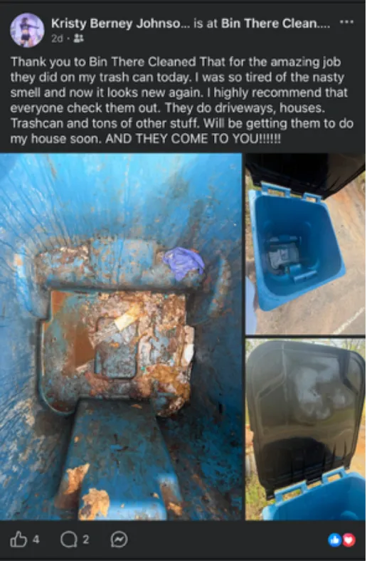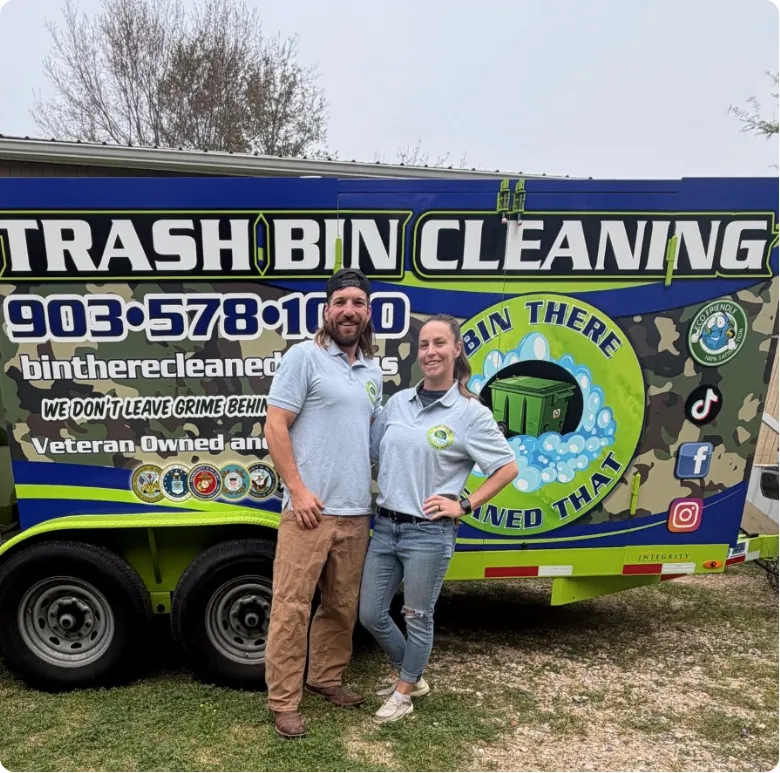 Bin There Cleaned That is a veteran-owned, family-run business operated by husband-and-wife team Dylan and Brittni. Dylan, a proud veteran and owner/operator, handles the hands-on work — from high-pressure sanitization to curbside service — while Brittni manages scheduling and customer care to keep everything running smoothly.