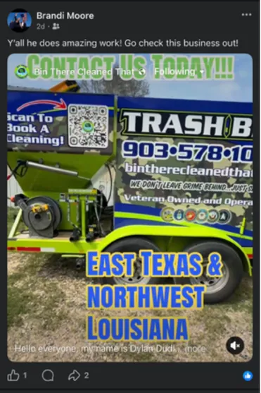 Dylan started this business because he saw how much the community needed a reliable, professional solution for cleaner, safer trash bins and exterior spaces. As a veteran, he's always believed in discipline, service, and doing the job right the first time. What began as a simple idea quickly became a mission to bring a higher standard of cleanliness to the homes and neighborhoods in East Texas and Northwest Louisiana.